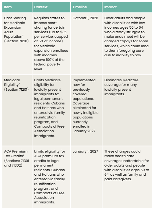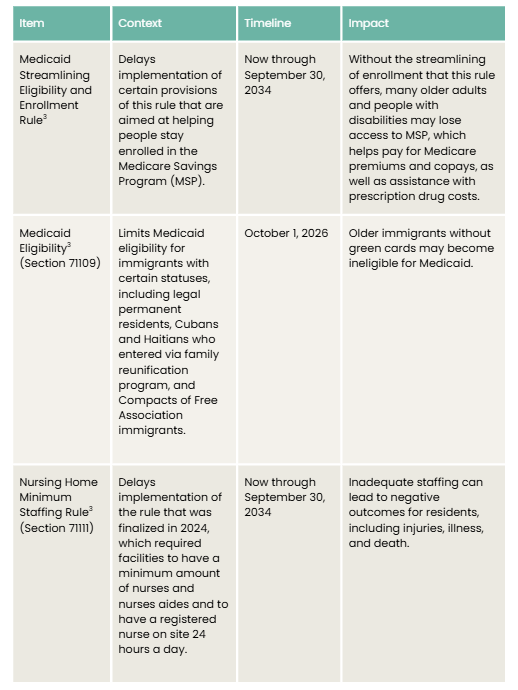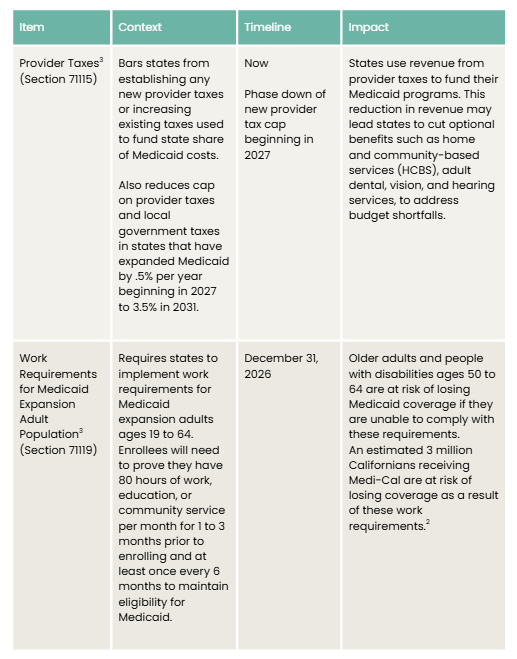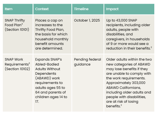 The federal reconciliation bill, H.R. 1, was enacted in early July. The bill includes dramatic reductions in funding that will impact health care access and food assistance for older adults and people with disabilities. Indeed, the California Health and Human Services Agency estimates nearly $34 billion in available funding is at risk due to various provisions of H.R. 1.2 While some of the reductions do not impact people age 65 and older, the implementation of work requirements and changes to eligibility for Affordable Care Act (ACA) tax credits will impact older adults age 50 to 64, as well as family and paid caregivers. As previously mentioned, the California final budget does not account for impacts from reductions in federal spending for key programs, including Medicaid and the Supplemental Nutrition Assistance Program (SNAP). The California legislature could address the budget impacts of H.R. 1 as early as September, either through a special session or additional budget bills. The following are key reductions that will impact older adults and people with disabilities in California.