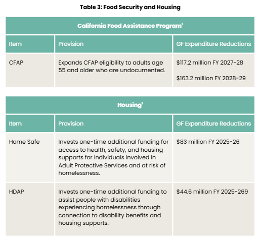 The enacted budget preserves aging programs and services at baseline funding levels. Many of the proposed cuts from the May Revise were not included. Additionally, it protects investments in food security for older adults who are undocumented and includes new funding for housing programs aimed at serving older adults and people with disabilities. The following is a summary of the provisions that will affect older adults and people with disabilities.